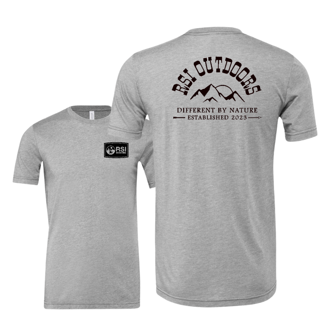 Crafted in a lightweight athletic heather gray, this tee features a front RSI Outdoors logo patch and a back design with mountain graphics and the statement: “Different by Nature – Established 2023.” Clean, classic, and full of purpose, it’s made for those who don’t just follow the path — they forge their own.